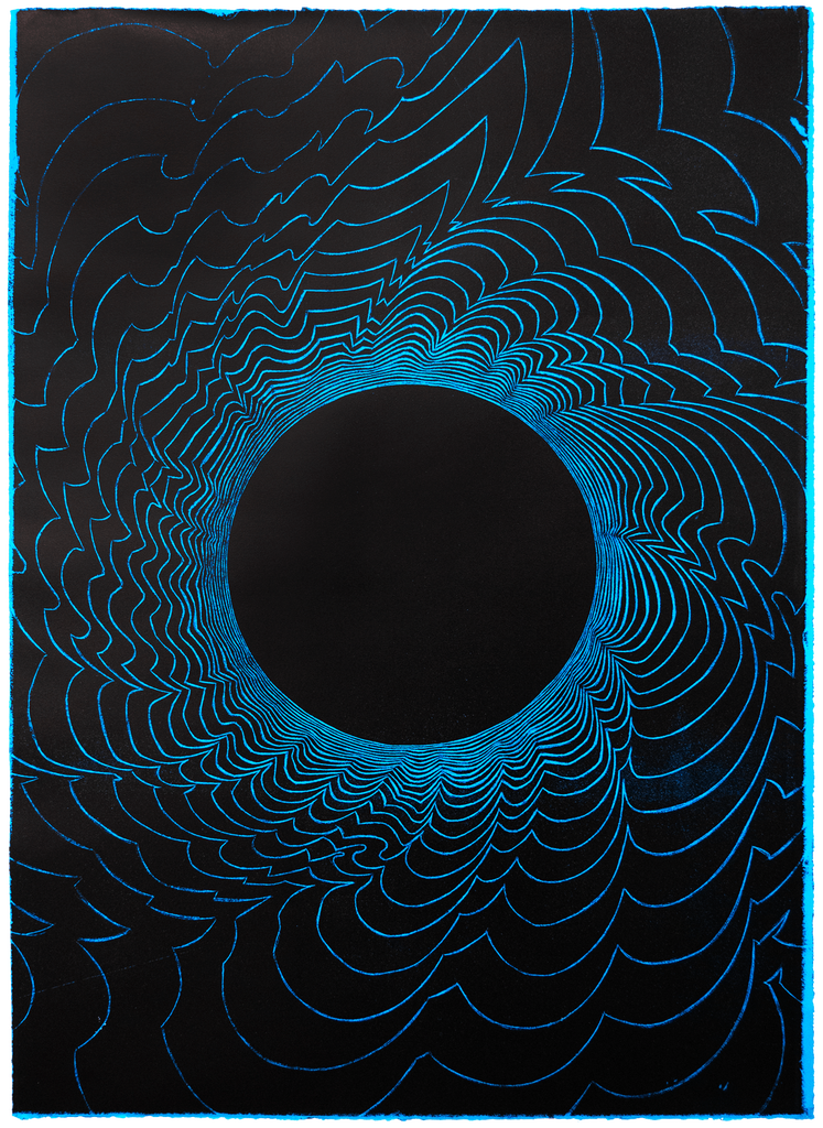 Hypnotiserende patronen ontstaan langs de randen van het canvas. Naar binnen toe wordt de tijdelijke schijn van de vorm losgelaten. Hier blijft enkel de geestelijke omgang met de leegte over; een vormloze stilte, slapend in de duisternis.